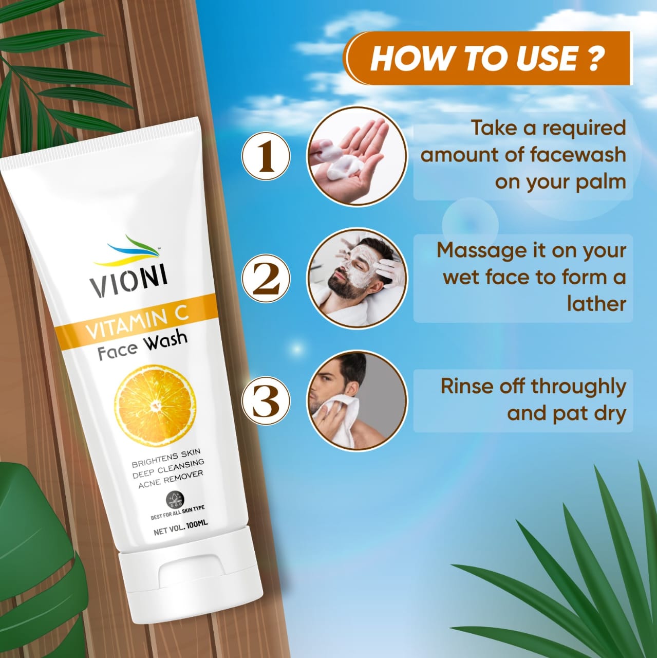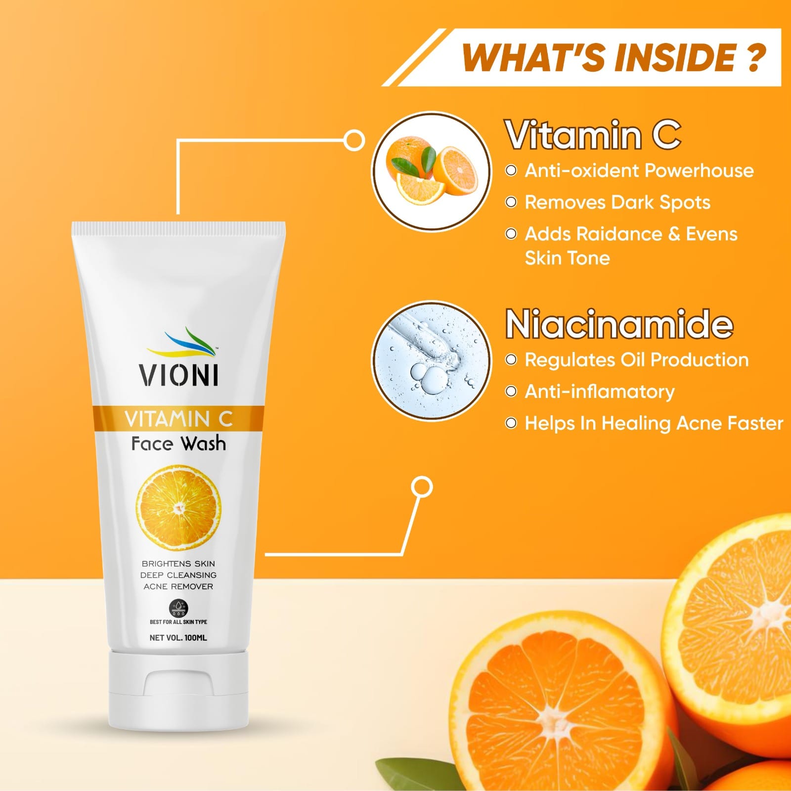 VIONI Vitamin C Face Wash for Brightening, Acne Control & Oil-Free Skin (100ml)